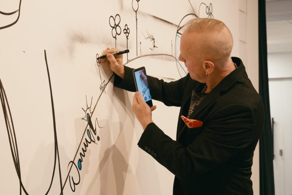 Artist Rowdy Warren in front of his works at the Hyatt Hotel Canberra, where the historic Howard’s Lounge has been transformed into an art gallery. Photo: Hyatt Hotel Canberra.
