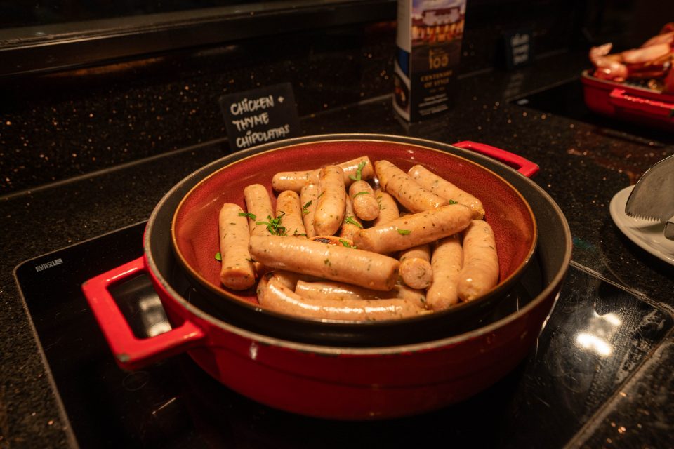 Hot breakfast items stay perfectly warm in red casserole dishes: plump sausages, curls of fried bacon, baked beans, scrambled eggs, mushrooms, hash browns, and more.