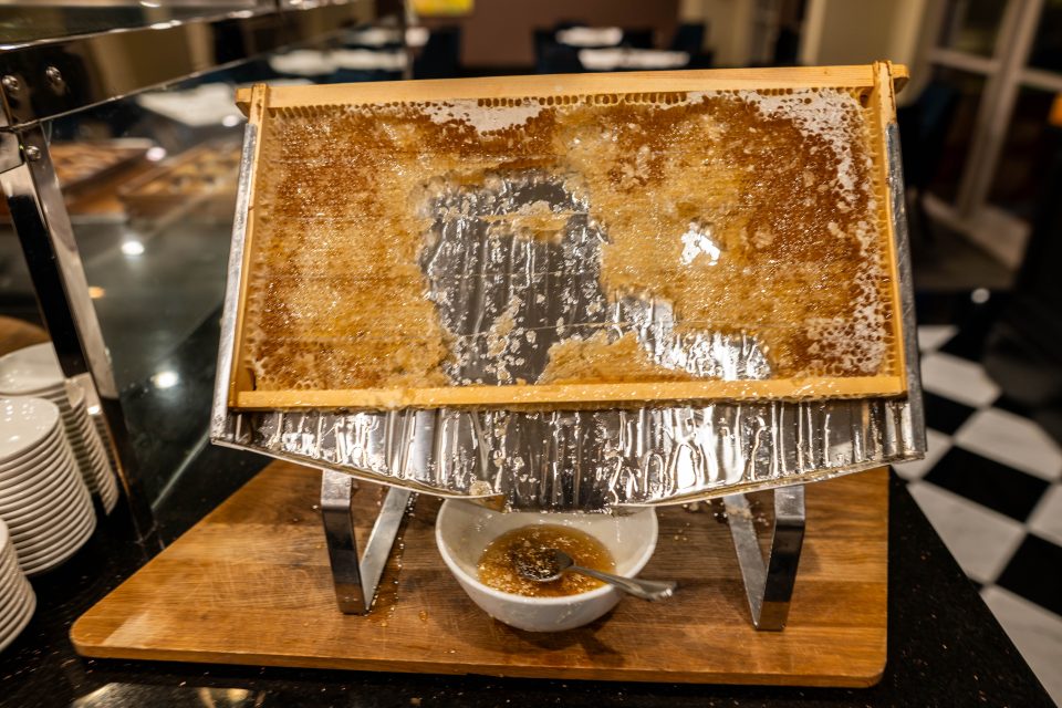 You can stack up fluffy buttermilk pancakes and choose from a fun array of toppings, including a strawberries-and-cream option with both fresh and compote berries. Maybe I don’t get out much, but the honey service feels so extra, and I love it.