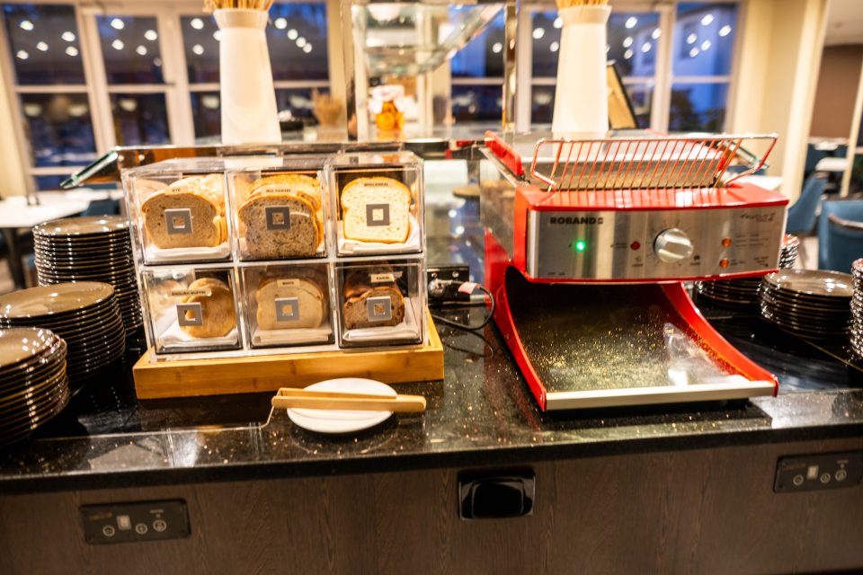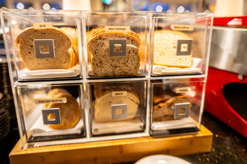 The bread station offers a wide variety of breads to suit every taste. Toast it yourself, then spread it with what feels like endless choices.