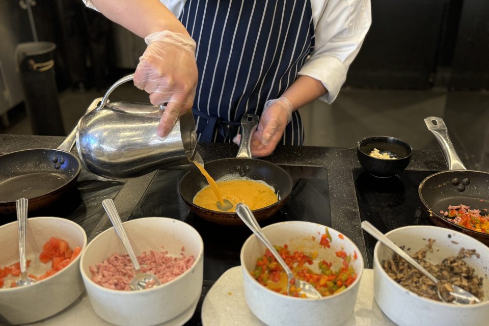 The egg station always brings me joy – cooked any way you like. I opt for an omelette, pillowy and oozing with vegetables and cheese, cooked just right.