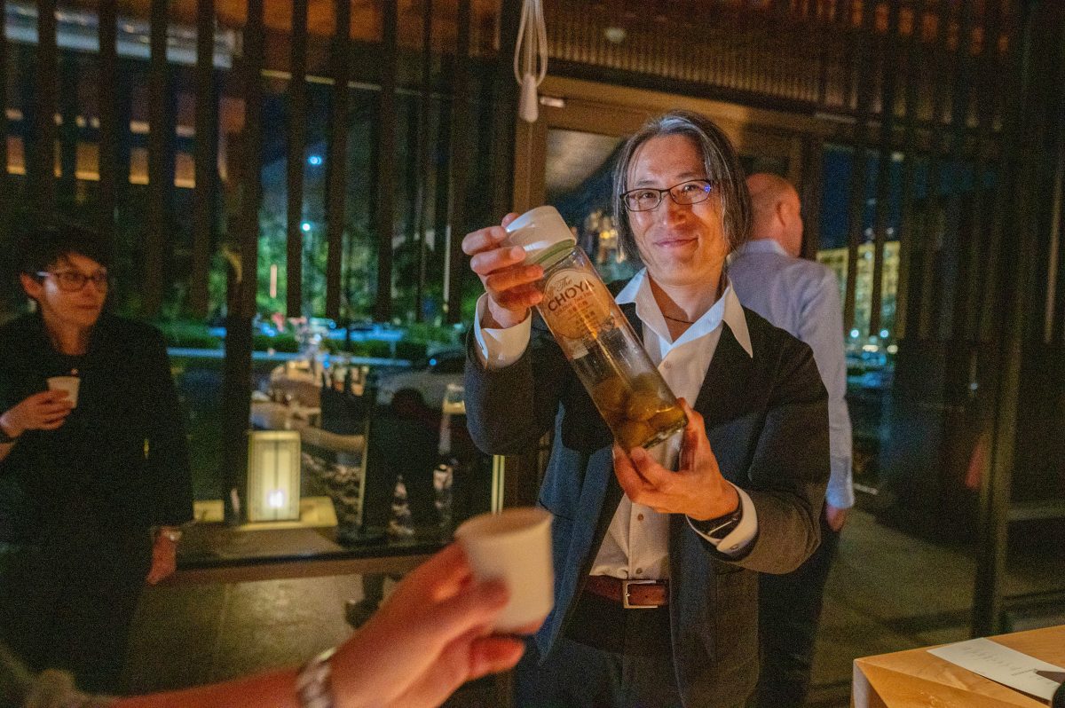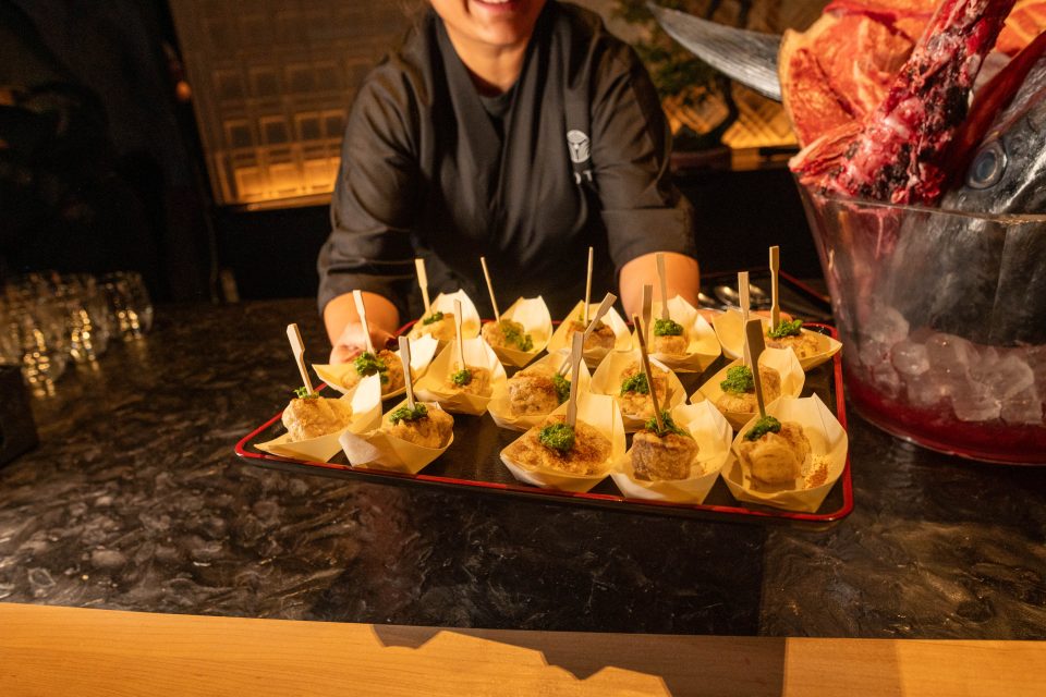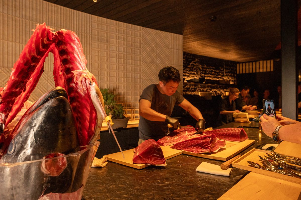 The bar area becomes a stage, with three simultaneous acts: tuna preparation, cocktail crafting by mixologists, and sake tastings poured by a head brewer from Japan.