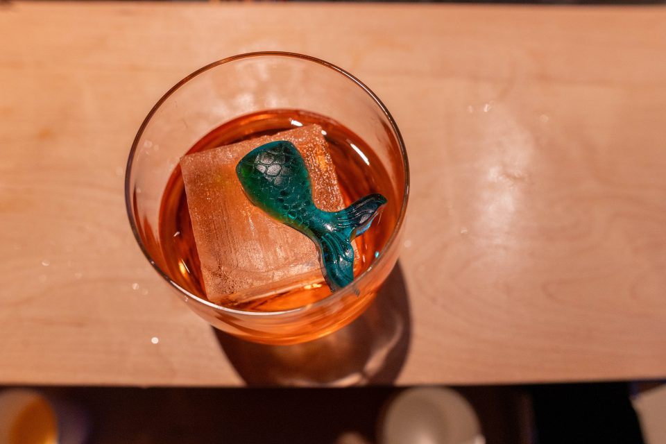 Our second, the Ichigo Blush, blends strawberry and yuzu with coconut. A jelly mermaid tail floats adrift on the large square ice cube. This drink goes down very easily.