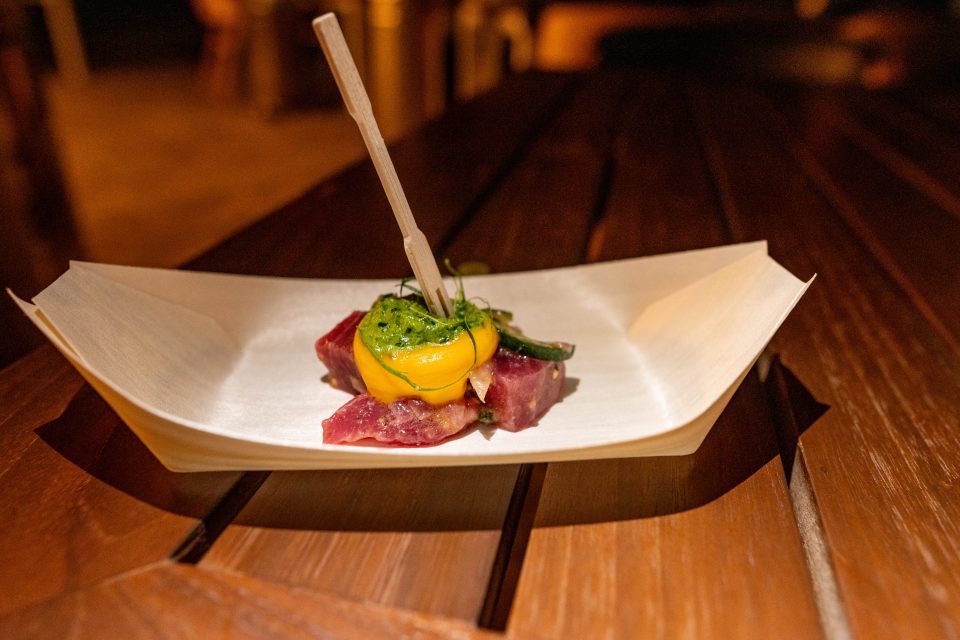 The last canapé I try is the tuna ceviche on pumpkin puree. It’s bright and tangy against the luxurious cream of whipped pumpkin, and wrapped together in a tangy citrus dollop of yuzu kosho dressing.