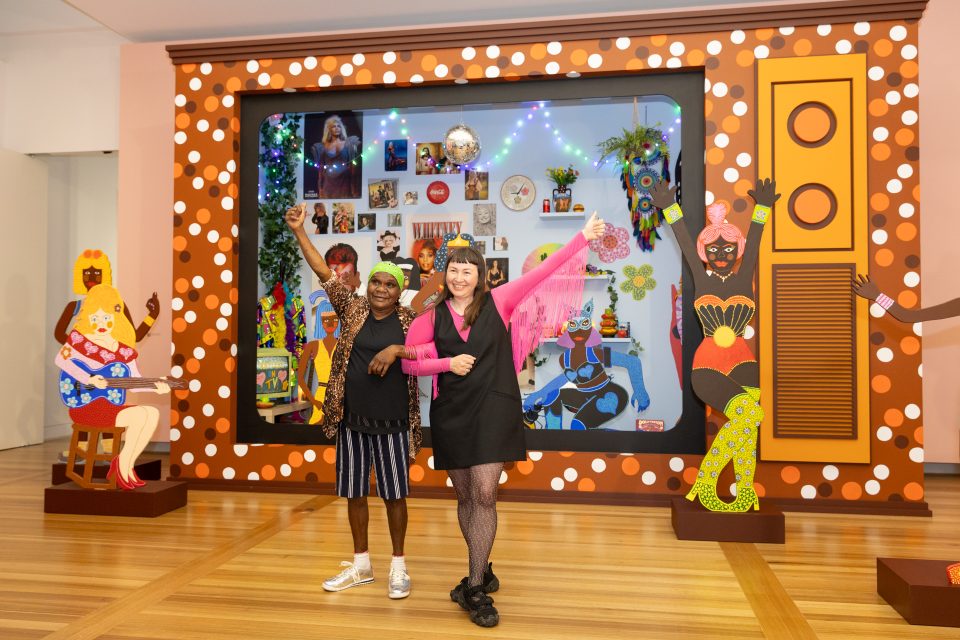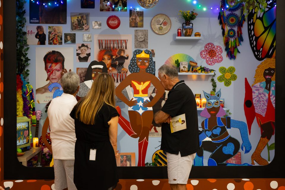 Under the slogan ‘from comic to canvas’, Kaylene Whiskey from her remote community in Indulkana on the APY lands at the Iwantja Arts Centre, creates her colourful hybrid world where Dolly Parton, Tina Turner, Wonder Woman, Whoopi Goldberg and Cat Woman pop in to gather bush tucker or to wish Kaylene Whiskey a happy birthday.