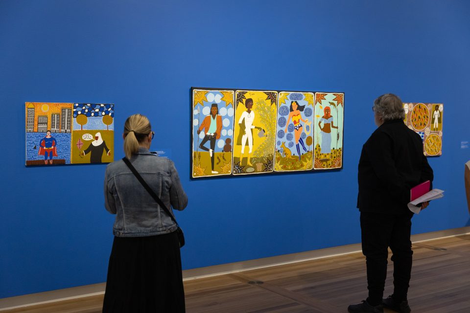 The National Portrait Gallery exhibition is the largest show of Kaylene Whiskey’s work to be ever assembled, with over 80 exhibits, including the new triptych Super Cathy, Lighting the torch, Super Cathy, Running the race and Super Cathy, The winner, all painted this year, with acrylics, as are almost all of the works on display.