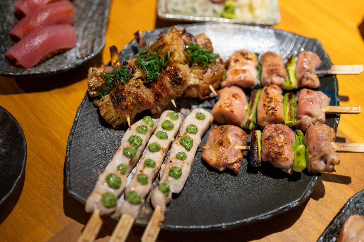 Mixed skewer plate! The ones at the back are the pork-belly wrapped enoki mushrooms. Photo: Kazuri Photography.