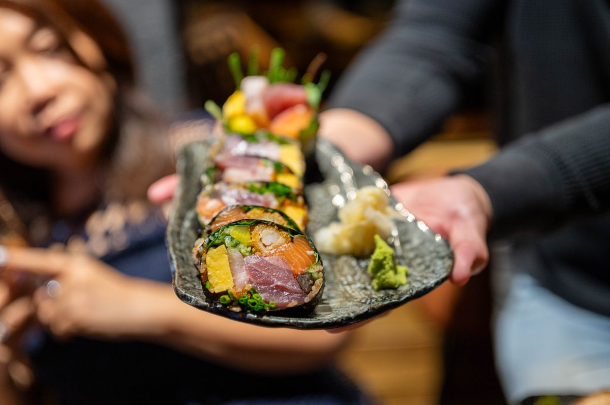 Oversized Futomaki sushi is plump discs with colourful wedges. Photo: Kazuri Photography.