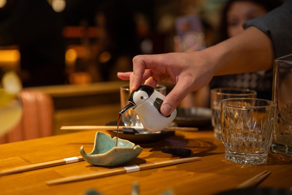 As well as trying some of the fresh new dishes, we dive into a yakitori classic: a plate of mixed skewers that is simple, iconic, and flavour-packed. The charcoal grill imbues its smoky notes into the tender cubes of meat. We enjoy skewers topped with green dollops of zingy citrus shiso pesto, and chicken thigh skewers flush with spring onions that have caramelised, bringing sweetness to the umami char.