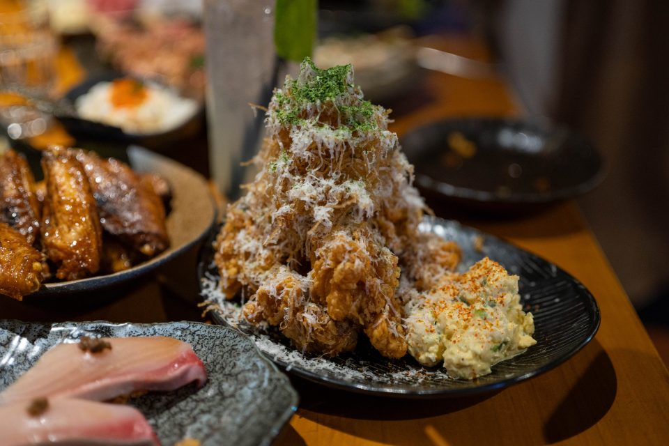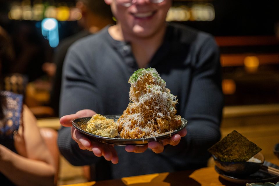 The Mt. Fuji of a dish comes out – a larger plate that, to my mind, is like an Asian twist on the game-day combo of fried chicken and potato salad. The batter on the karaage fried chicken is light, crisp, and delicately seasoned. Impossibly crunchy strands of fried potato top the chicken, and creamy egg salad sits alongside. A generous dusting of finely grated Parmesan tops the entirety.